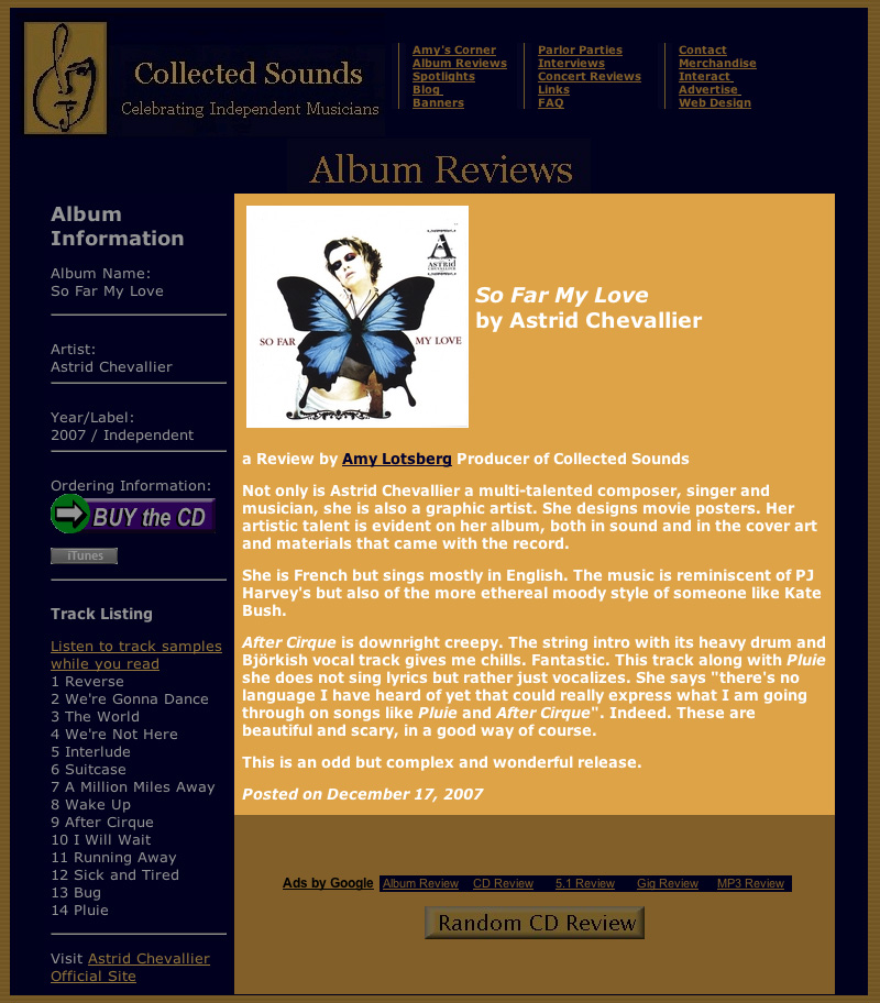 Non seulement Astrid Chevallier a de multiples talents de compositeur, chanteuse et musicienne, elle est aussi graphiste. Elle crée des affiches de films. Son talent artistique est exposé partout sur son album, il est présent dans le son, sur la pochette et dans le dossier qui est arrivé avec le CD.