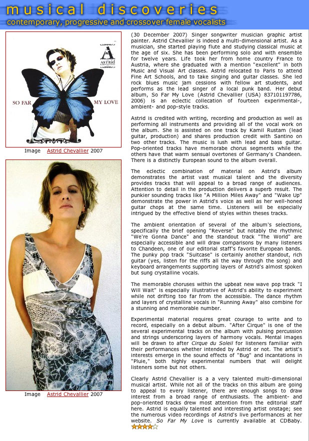 Il est clair qu'Astrid Chevallier est une artiste multi-dimentionelle très talentueuse. Bien que tous les morceaux sur cet album ne vont pas plaire à tous les auditeurs, il y a assez de chanson pour attirer l'attention d'une large gamme d'enthousiastes. Les morceaux ambiants - et orientés pop - ont principalement retenu l'attention du staff éditorial ici. Astrid est également talentueuse et intéressante sur scène; regardez les nombreux enregistrement vidéos des concerts live d'Astrid sur son site web.